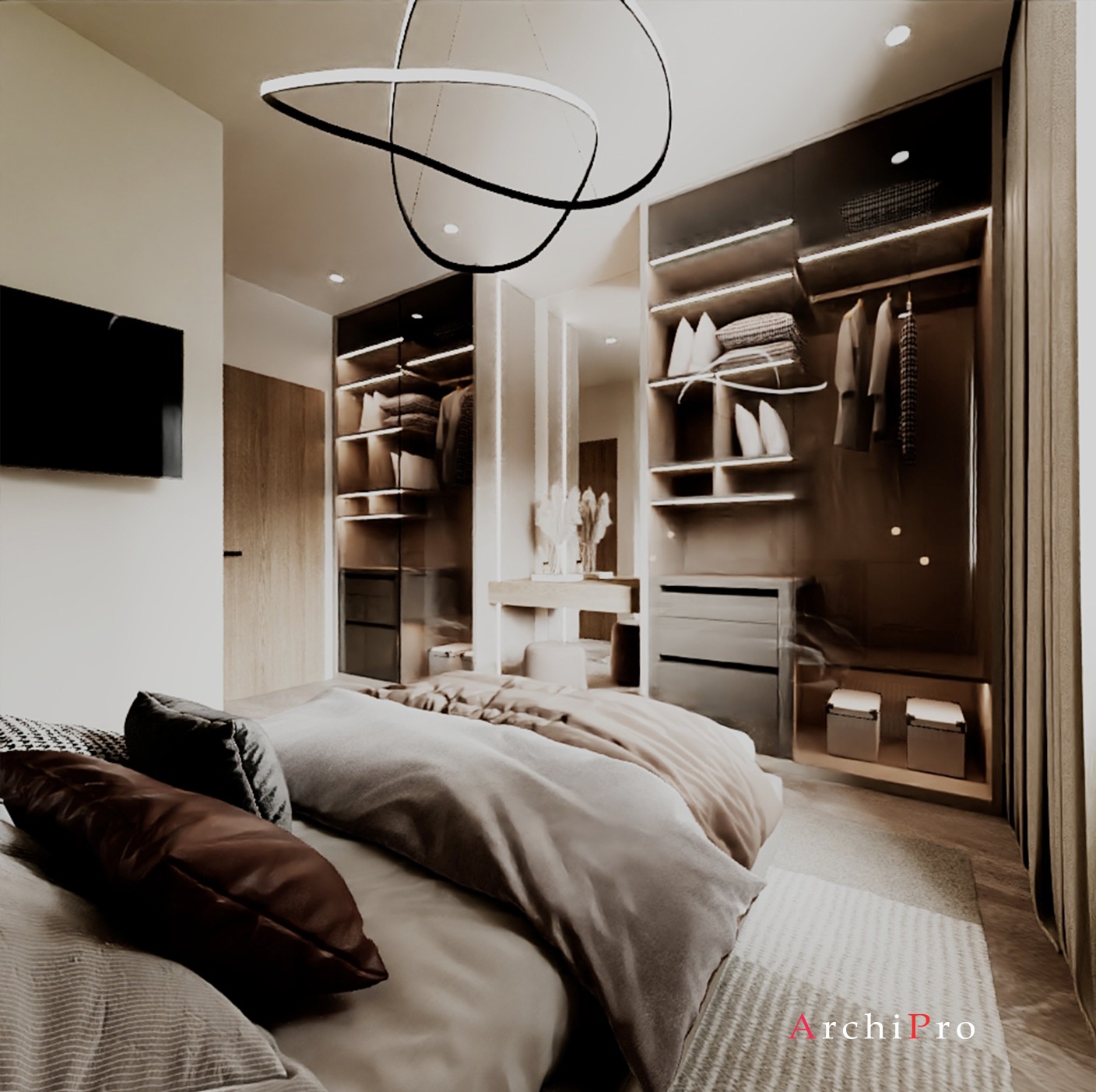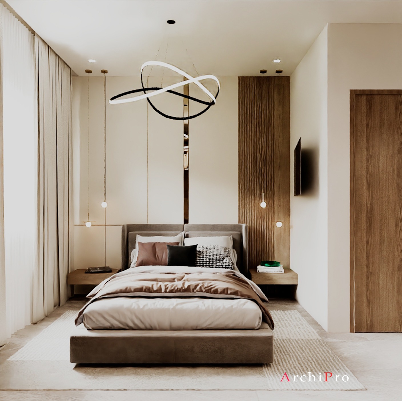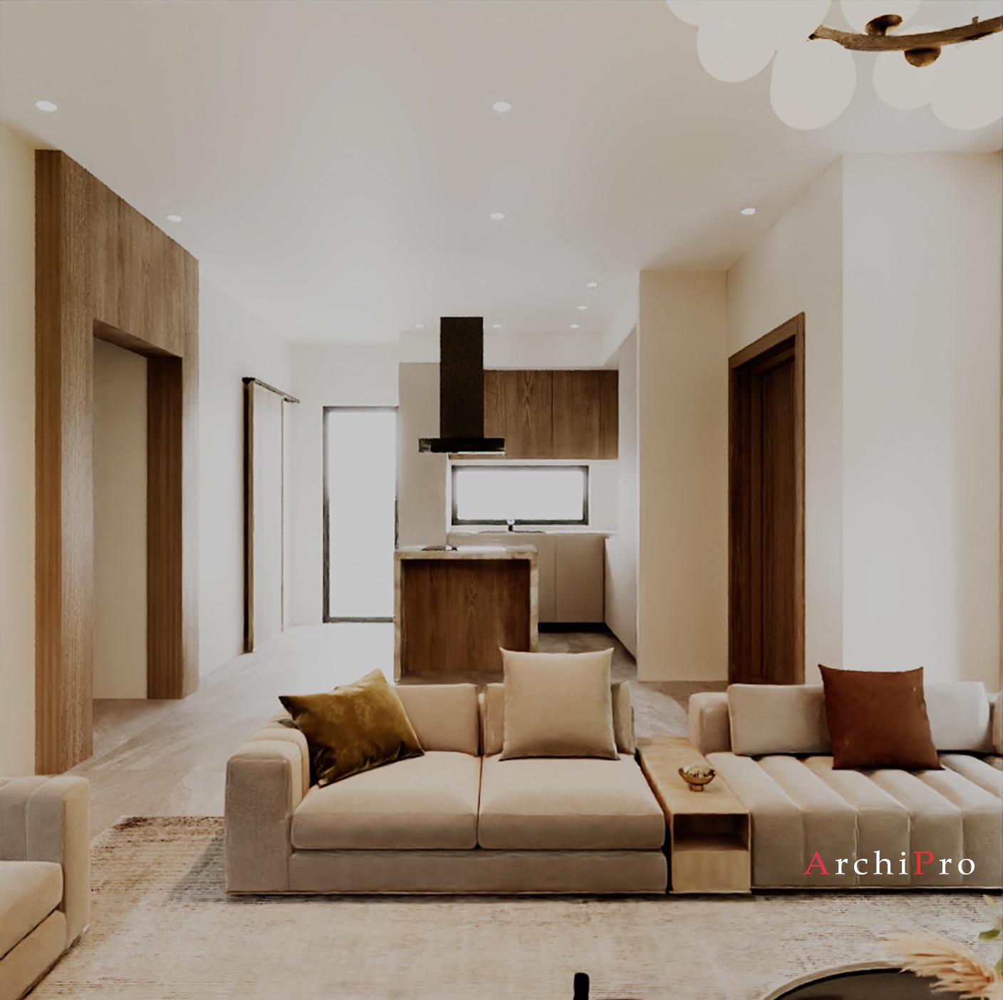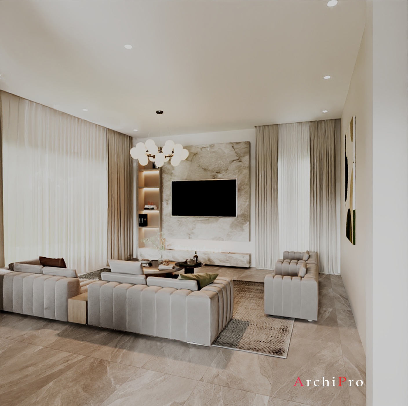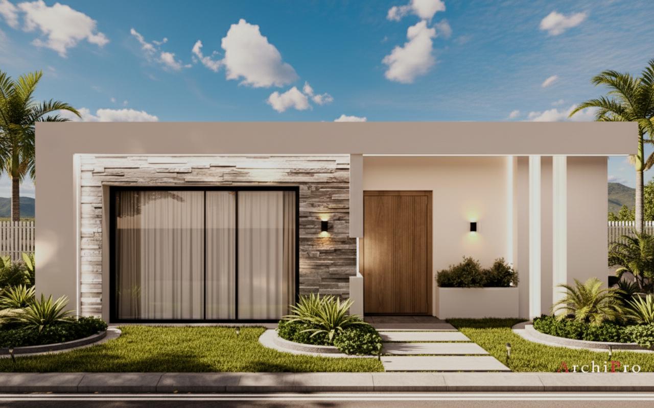 Cette maison incarne un style moderne minimaliste caractérisé par une toiture plate et un volume simple, créant une façade horizontale et épurée. La façade est enrichie par un jeu de contrastes de matériaux entre le crépi clair et un mur de revêtement en pierre sèche nuancée. L’aménagement extérieur soigné intègre un grand coulissant vitré et une porte d’entrée en bois, le tout mis en valeur par un éclairage mural discret.