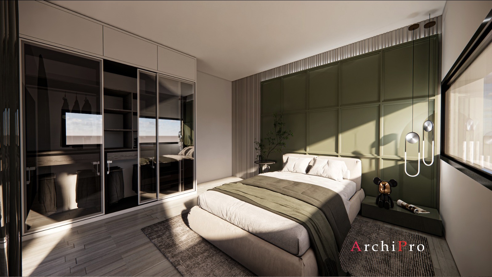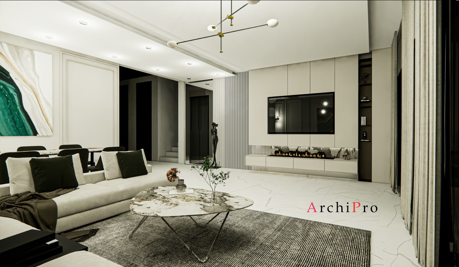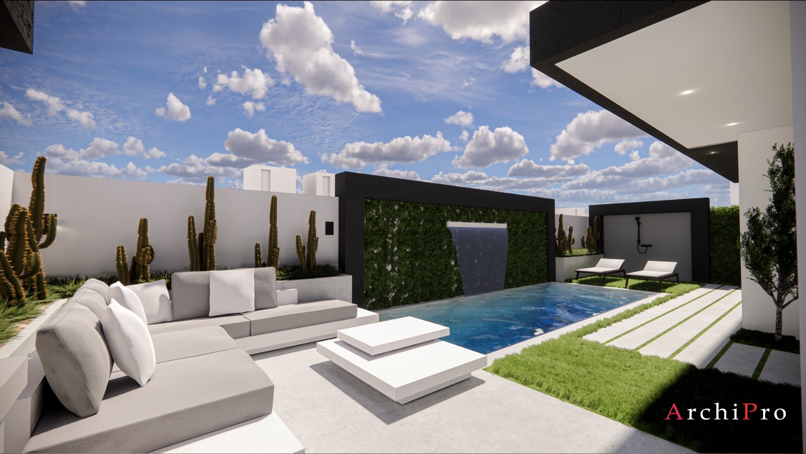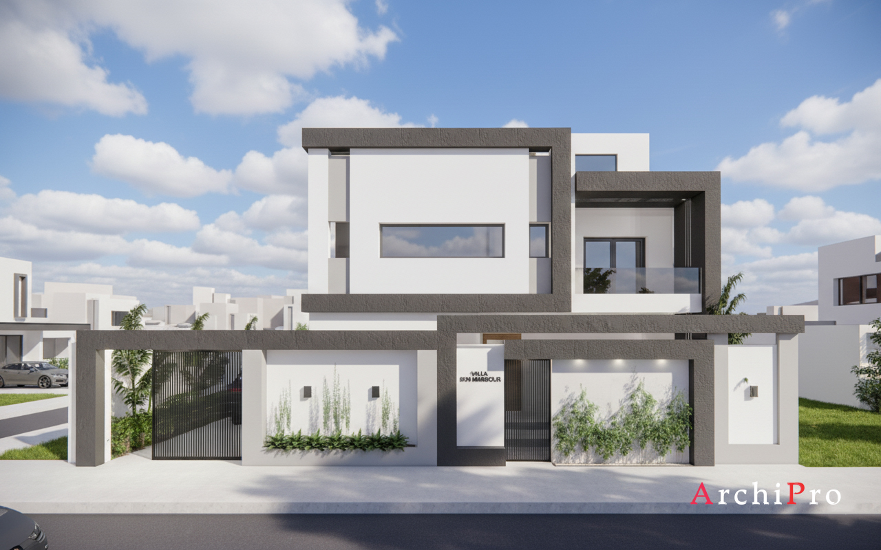 Cette villa contemporaine se distingue par son jeu de volumes cubiques et son contraste marqué entre le blanc immaculé des murs et les cadres structurels gris anthracite (ou noir). La façade est dynamisée par l’encadrement en portique qui intègre l’entrée et les jardinières verticales, fusionnant l’esthétique minimaliste à une touche de verdure. L’ensemble est conçu pour une vie moderne et urbaine, mis en valeur par un éclairage nocturne ciblé et une ligne de toits plats.